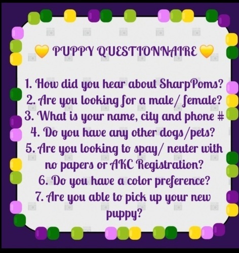 LAST UPDATED JANUARY 23, 2026 *🙏 WE HAVE PUPPIES! PICTURES BELOW! PLEASE CONTACT ME TO FILL OUT THE QUESTIONNAIRE IF INTERESTED, THANK YOU FOR VISITING SHARP POMS. 💜 REFRESH THIS PAGE DAILY FOR UPDATES* ~ Blessed Pomeranian Owner & Breeder Since 1987 ~ Welcome To Our "Available Puppies Page" ~ THE STORK HAS ARRIVED! ~ We DO NOT guarantee the color, size, breeding or show quality of the Pomeranian, only the health of the Pom at the time of sale against life threatening illness that may be discovered during the 72 hour health guarantee. We can only give a guesstimation of the potential adult weight through parents sizes and a chart we refer to. Most of our puppies average in size from 3 to 7 lbs but some may be larger or smaller. We require a Non-Refundable deposit to hold a puppy for you with the balance due in full by age 8 weeks old. If for any reason you change your mind about the purchase of the Pomeranian, you will lose your deposit and all monies paid toward the puppy and the puppy will be relisted as available. Please be aware of these issues before commiting to purchase one of our babies. ___________________________________________________________________ |