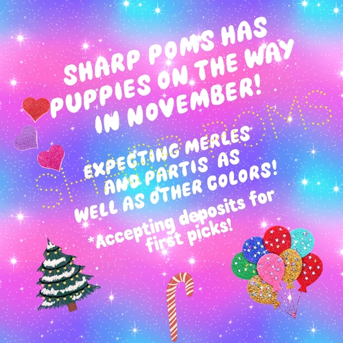 LAST UPDATED NOVEMBER 12, 2025 *🙏 -WE HAVE 3 MERLE LITTERS DUE IN NOVEMBER! PLEASE CONTACT ME TO FILL OUT THE QUESTIONNAIRE IF INTERESTED, THANK YOU FOR VISITING SHARP POMS. 💜 REFRESH THIS PAGE DAILY FOR UPDATES* ~ Blessed Pomeranian Owner & Breeder Since 1987 ~ Welcome To Our "Available Puppies Page" ~ THE STORK HAS ARRIVED! ~ We DO NOT guarantee the color, size, breeding or show quality of the Pomeranian, only the health of the Pom at the time of sale against life threatening illness that may be discovered during the 72 hour health guarantee. We can only give a guesstimation of the potential adult weight through parents sizes and a chart we refer to. Most of our puppies average in size from 3 to 7 lbs but some may be larger or smaller. We require a Non-Refundable deposit to hold a puppy for you with the balance due in full by age 8 weeks old. If for any reason you change your mind about the purchase of the Pomeranian, you will lose your deposit and all monies paid toward the puppy and the puppy will be relisted as available. Please be aware of these issues before commiting to purchase one of our babies. ___________________________________________________________________ |