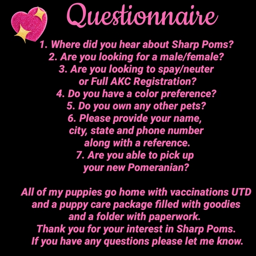 LAST UPDATED MARCH 14, 2026 *🙏 THE STORK HAS ARRIVED! WE HAVE PUPPIES! PICTURES BELOW! 💜 ADULTS ALSO COMING AVAILABLE IN MARCH! PLEASE CONTACT ME TO FILL OUT THE QUESTIONNAIRE IF INTERESTED, THANK YOU FOR VISITING SHARP POMS. 💜 REFRESH THIS PAGE DAILY FOR UPDATES* ~ Blessed Pomeranian Owner & Breeder Since 1987 ~ Welcome To Our "Available Puppies Page" ~ THE STORK HAS ARRIVED! ~ We DO NOT guarantee the color, size, breeding or show quality of the Pomeranian, only the health of the Pom at the time of sale against life threatening illness that may be discovered during the 72 hour health guarantee. We can only give a guesstimation of the potential adult weight through parents sizes and a chart we refer to. Most of our puppies average in size from 3 to 7 lbs but some may be larger or smaller. We require a Non-Refundable deposit to hold a puppy for you with the balance due in full by age 8 weeks old. If for any reason you change your mind about the purchase of the Pomeranian, you will lose your deposit and all monies paid toward the puppy and the puppy will be relisted as available. Please be aware of these issues before commiting to purchase one of our babies. ___________________________________________________________________ |